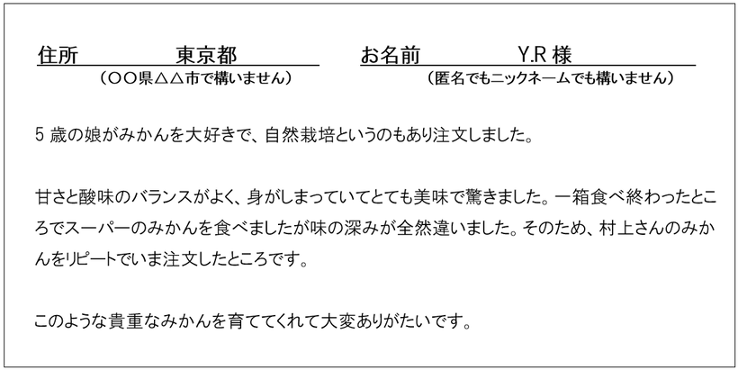 村上さんのみかんを初めて頂きました。とても美味しくて購入して良かった!と思ってます。何より安心して食べられる事が有り難く栽培中のご苦労は、素人の私には 想像もつきませんがこうやって身体が喜ぶ食べ物を育てて下さる方がいらっしゃる事に心から感謝しています。ありがとうございます。程良い甘味と酸味が素晴らしく、本当に美味しいです!家族も喜んでいました。今回離れて暮らす娘にも送りました所 1歳の孫も喜んで食べていたそうで、娘も安心して食べさせられるので有難い!と喜んでいました。最後になりましたが、私の手元に届くまで関わってくださる皆さんにとても感謝しています。ありがとうございます。これからも宜しくお願いします。